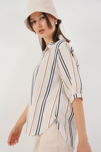 Çizgili Kısa Kol Gömlek 20345 Bej